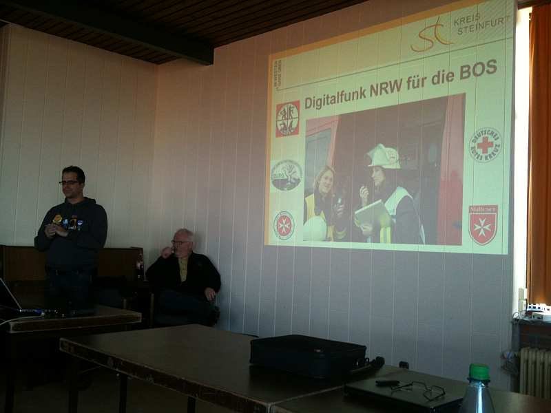 Kreisbrandmeister Bernd Duesmann und Kreisbediensteter Christoff Schwarz informierten über den Digitalfunk, der bei uns im Kreis Steinfurt Anfang 2013 in den erweiterten Probebetrieb gehen wird. Es gab viele technische Informationen zur Funktionsweise des neuen Netzes und die Abwickelung der Einführung. Mit einer Präsentation erhielten die Führungskräfte so im Vorfeld die Einweisung in den Digitalfunk, die ab Anfang nächsten Jahres an den einzelnen Wehren jedem Feuerwehrkameraden durch den Kreis Steinfurt angeboten wird.