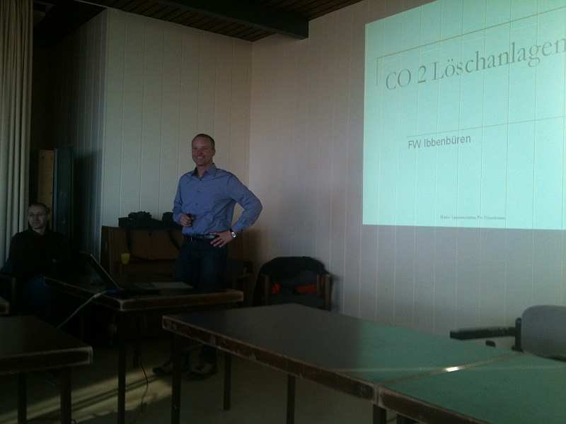 Zugführer Marko Lammerskitten referierte über den Einsatz vom CO2 als Löschmittel, dessen Eigenschaften und Wirkungen auf den menschlichen Organismus und über CO2-Löschanlagen in Anlehnung auch an die vor kurzem in Betrieb genommene neue CO2 Löschanlage bei der Firma ANGUS in Uffeln.