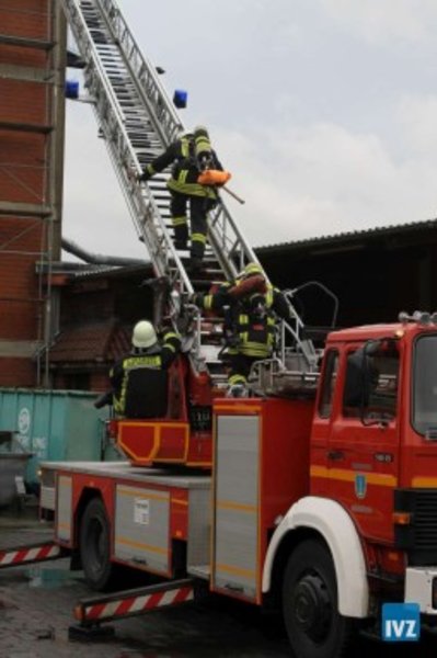 Mit Hilfe der DLK wurde der Spänebunker von mehreren Trupps unter Atemschutz mit Schaum beschickt.