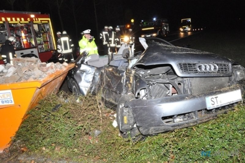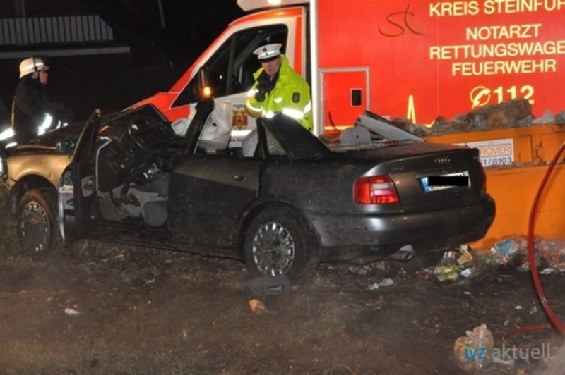 Ein PKW war vermutlich aufgrund eisglatter Straßen von der Straße abgekommen und mit einem in einer Hofeinfahrt stehenden Bauschuttcontainer kollidiert.