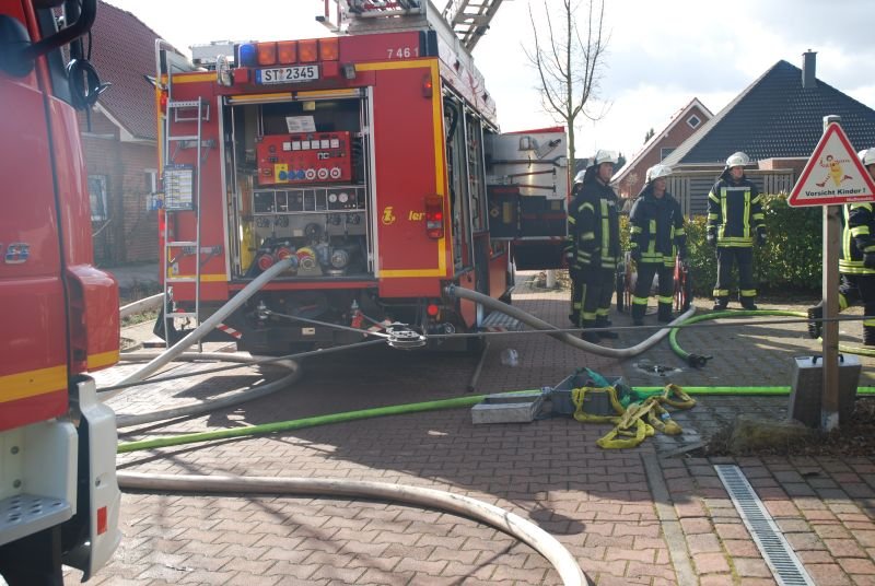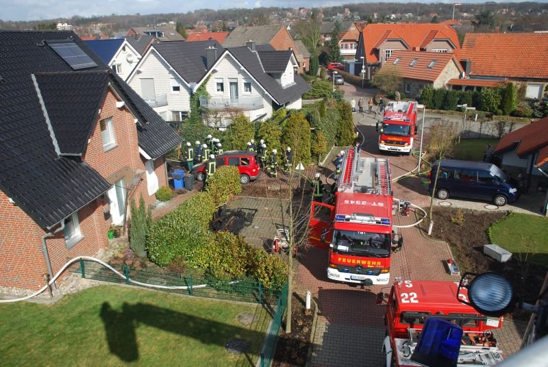 Beim Eintreffen stand das an ein Einfamilienhaus angebaute Carport in Vollbrand und drohte auf das Wohnhaus überzugreifen, so dass auch ein zweiter Löschzug (Zug I) direkt nachalarmiert wurde.