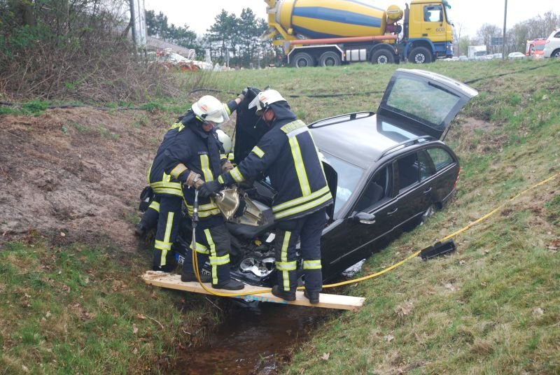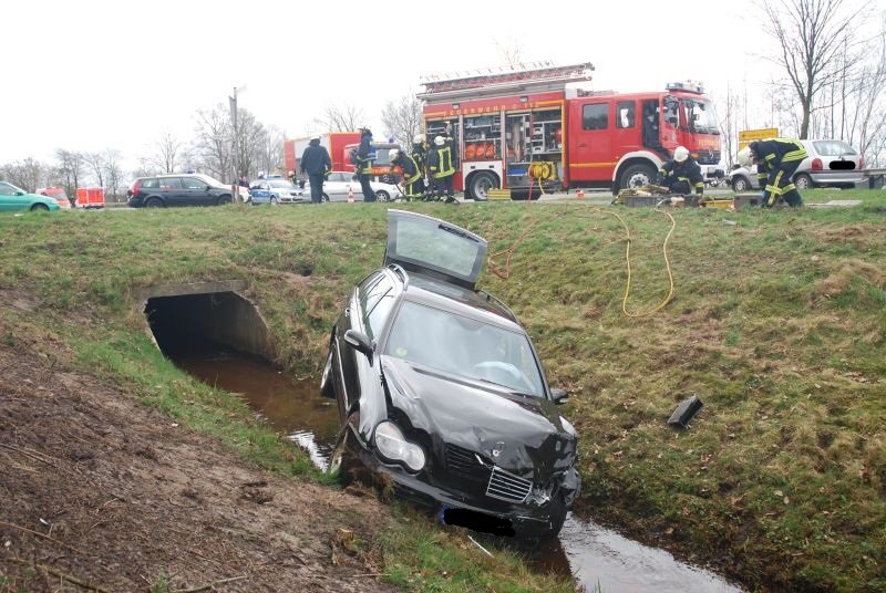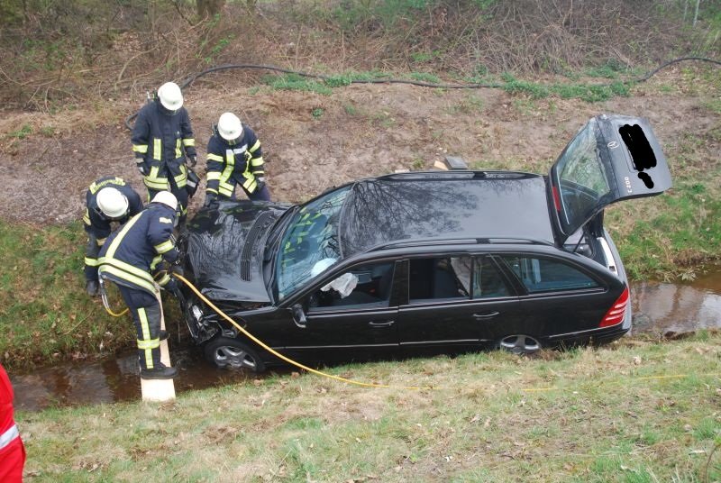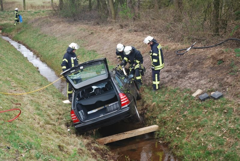 Im Kreuzungsbereich Dornierstraße/Ibbenbürener Straße war nach dem Zusammenstoß zweier Fahrzeuge das Eine in einem neben der Straße verlaufenden Bach zum Stehen gekommen.