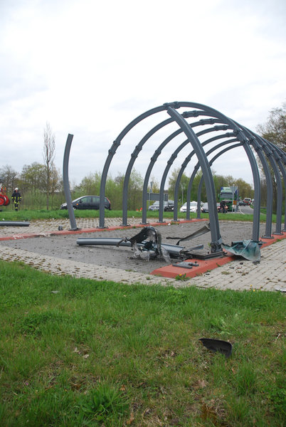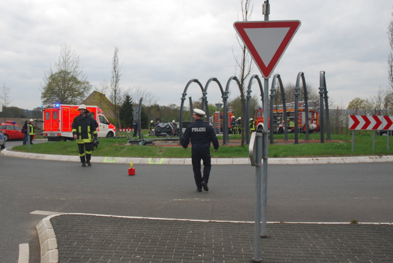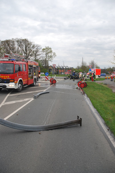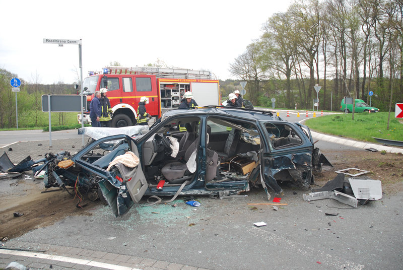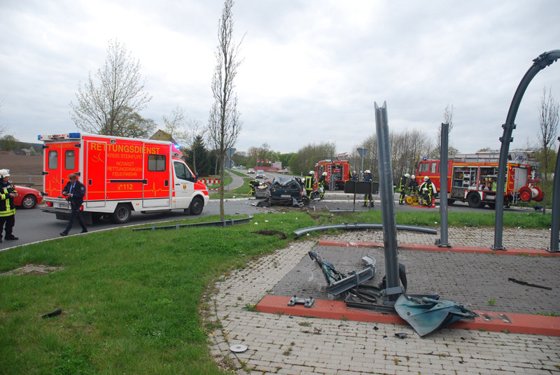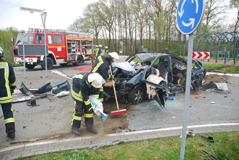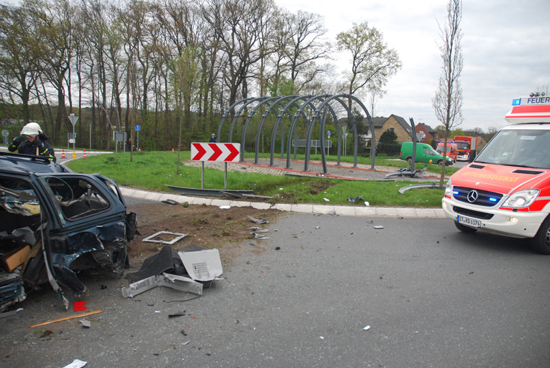 Die Kräfte der hauptamtlichen Wache und des Löschzugs Stadtmitte 2 fanden einen Pkw nach Alleinunfall vor, der quer über die Insel des Kreisverkehrs Püsselbürener Damm/Talstraße gefahren war. Hierbei war der Wagen mit mehreren Stahlträgern kollidiert und schwer beschädigt worden.