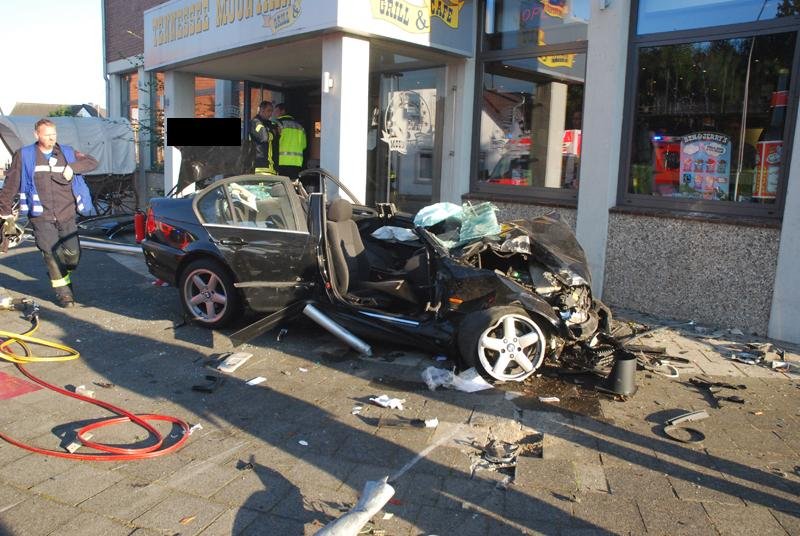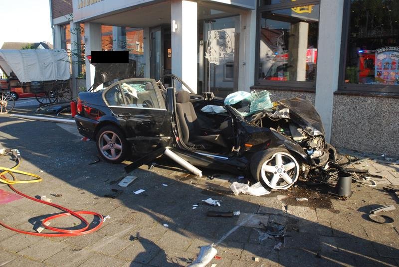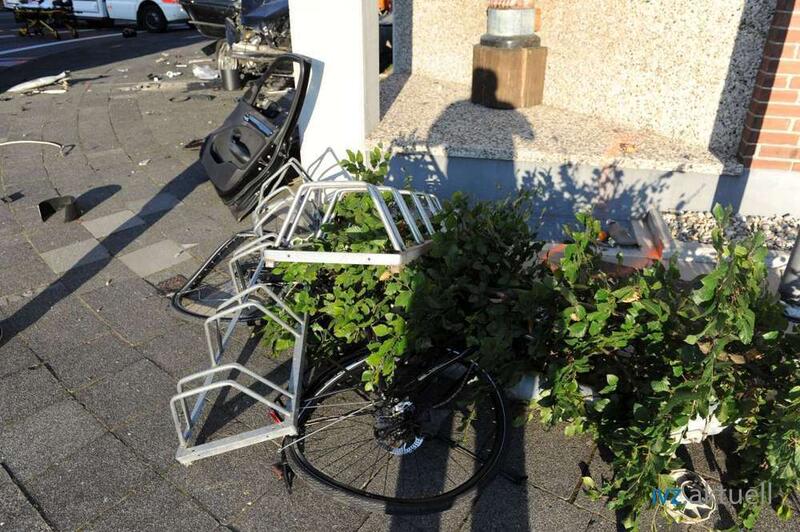 An der Münsterstraße, Kreuzung Tecklenburger Damm, war ein PKW aus ungeklärter Ursache von der Fahrbahn abgekommen, mit zwei Radfahrern kollidiert und an der Außenwand eines Restaurants zum Stehen gekommen.
