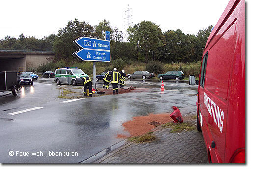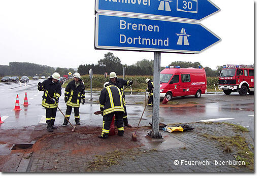 Nach VU Öl auf der Fahrbahn Fünfter Einsatz an diesem Tag"Wenn schon, denn schon..." Zu ihrem fünften Einsatz an diesem 1. Oktober 2005 wurde die Feuerwehr Ibbenbüren am Samstagmittag, gegen 13:50 Uhr beordert. An der Autobahnauffahrt Laggenbeck der BAB 30 war nach einem Verkehrsunfall Motoröl eines Pkws auf die Fahrbahn gelangt und drohte in die Kanalisation zu gelangen.