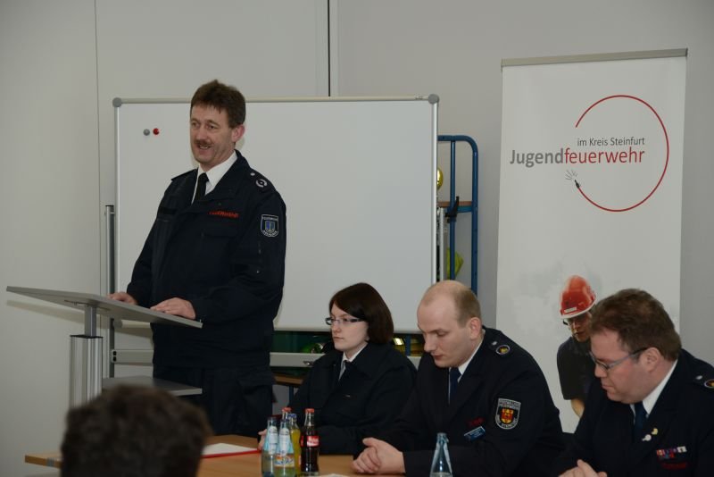 Wie wichtig die Jugendfeuerwehr (JF) als Nachwuchsorganisation der Feuerwehr für die spätere Einsatzbereitschaft der Freiwilligen Feuerwehren im Kreis Steinfurt ist, wusste die Gäste aus Politik und Verwaltung in Ihren Grußworten zu betonen. So sind in 22 JF-Gruppen in 20 Städten und Gemeinden heute rund 450 Jungen und Mädchen im Alter von zwölf bis 17 Jahren aktiv. Im letzten Jahr konnten 82 Mitglieder der Jugendfeuerwehren in die Einsatzabteilungen übernommen werden.