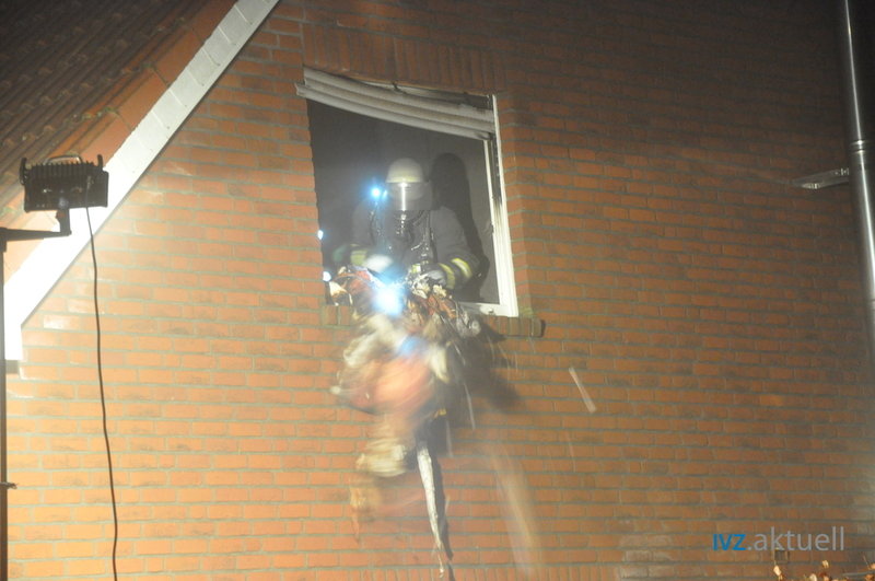 Im ersten Obergeschoss eines Doppelhauses war in einem Zimmer ein Feuer ausgebrochen. Zwei Trupps unter umluftunabhängigem Atemschutz drangen mit einem C-Rohr zum Brandherd vor und bekämpften das Feuer im Innenangriff.