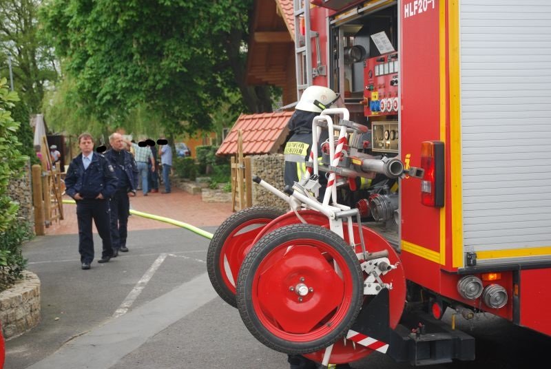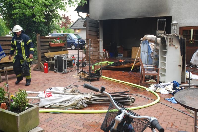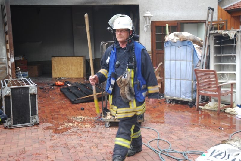 Bei Eintreffen der Feuerwehr brannte eine Garage im hinteren Bereich einer Gaststätte. Den ersteintreffenden Kräften gelang es mit einem Trupp unter umluftunabhängigem Atemschutz und einem C-Rohr, das Feuer schnell unter Kontrolle zu bringen.