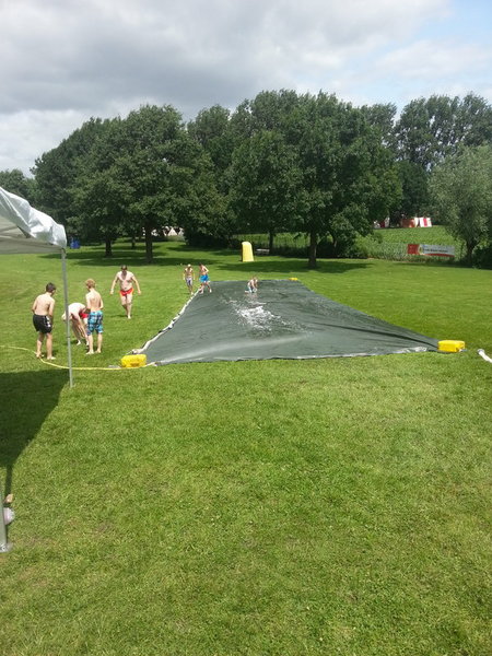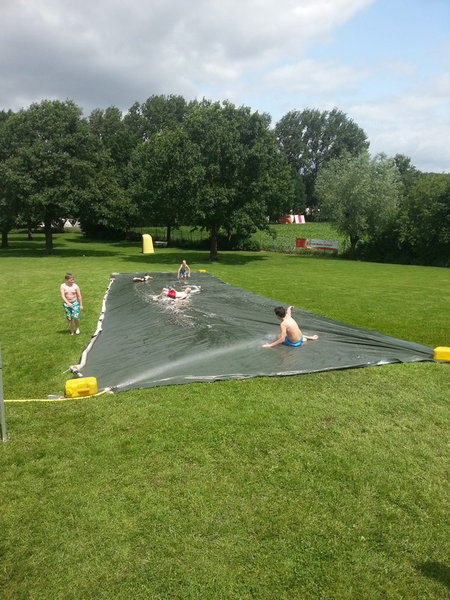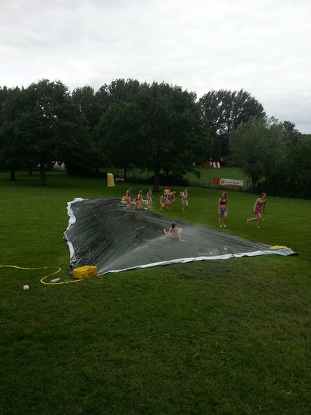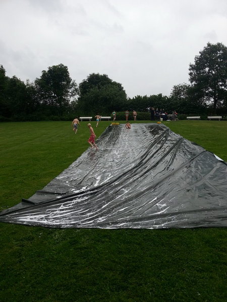 Auf der Liegefläche des Aaseebads wurde eine Gleitbahn aufgebaut. Diese bestand aus einer 25m langen Silofolie, die mit Wasser und Spülmittel benetzt wurde.