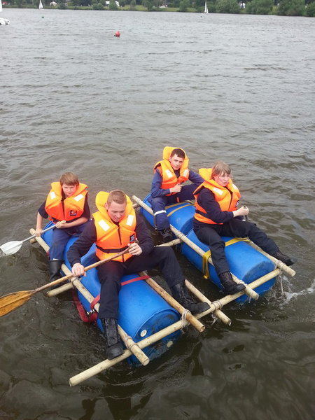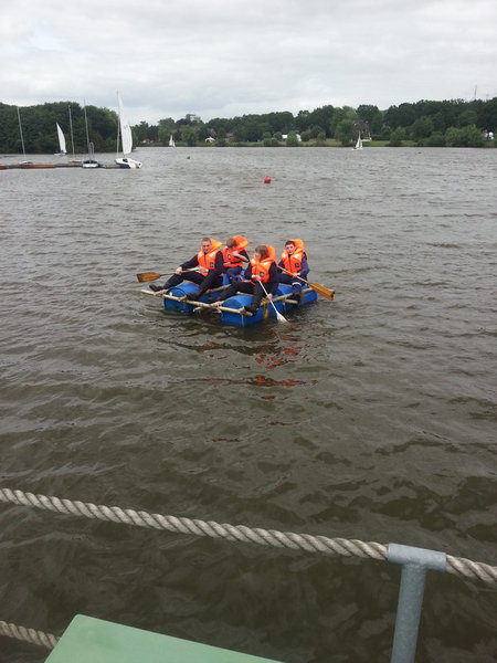 Am Aasee-Ufer gab es eine Station, für die man handwerkliches Geschick und ein wenig Mut brauchte: es gab einen Floßbausatz, den man nach dem zusammenbauen gleich auf dem Aasee testen durfte.