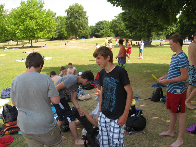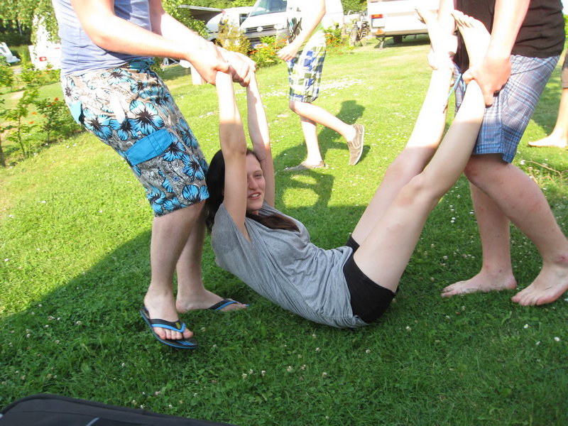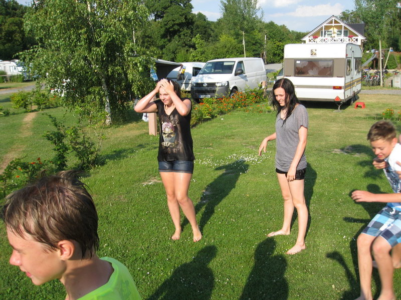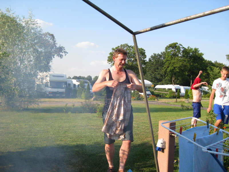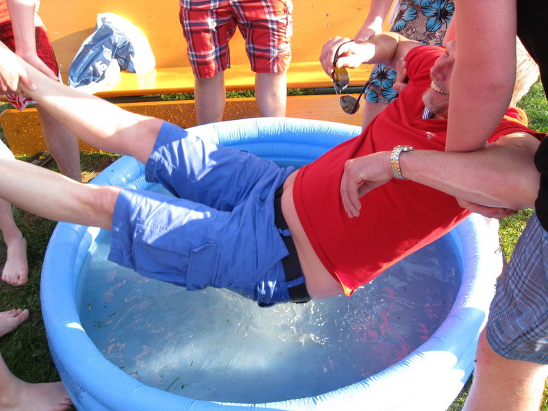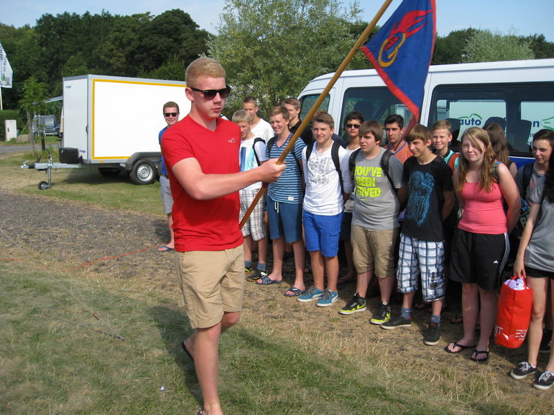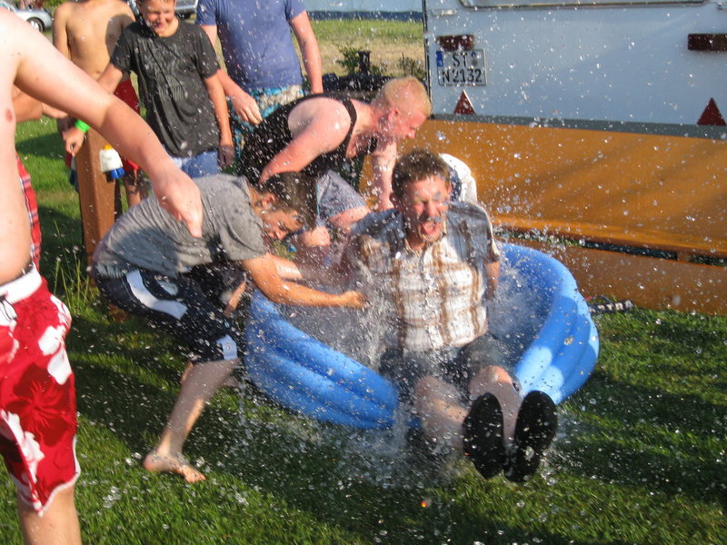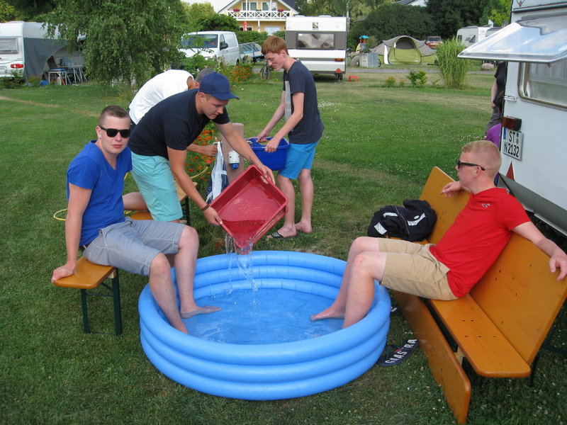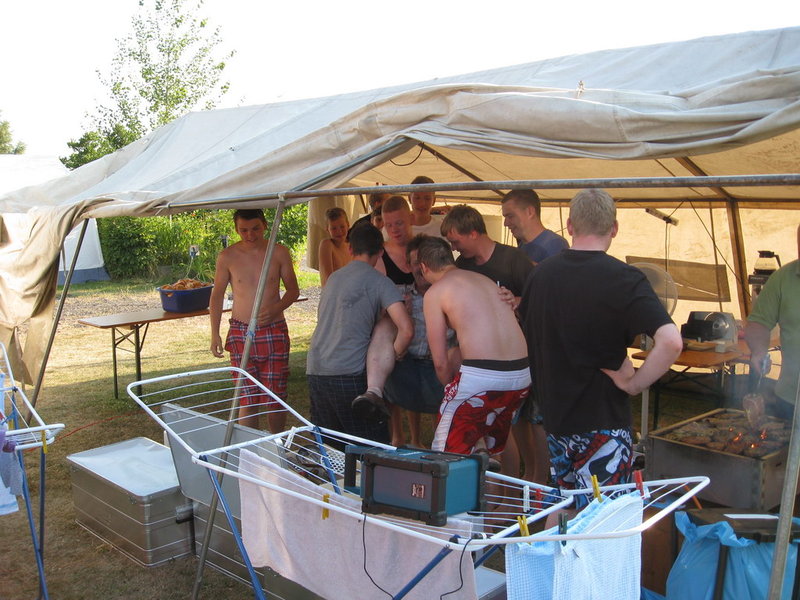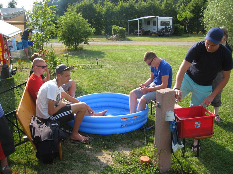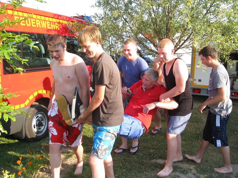 Gegen Nachmittag erreichten wir wieder unseren Zeltplatz und empfingen unseren Wehrführer Karl-Heinz Rolf und dessen Stellvertreter Stefan Steinigeweg. Beide besuchten zum ersten Mal in ihren neuen Ämtern das Jugendfeuerwehrzeltlager, und so ließen es sich die Jungs und Mädels nicht entgehen, eine traditionelle Lagertaufe durchzuführen.