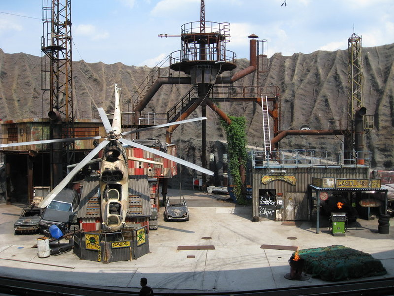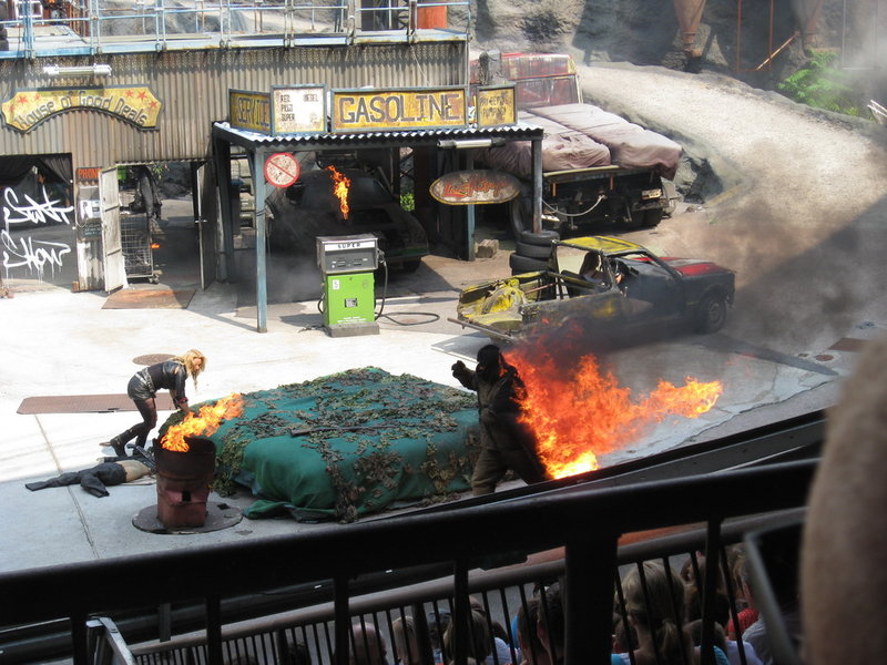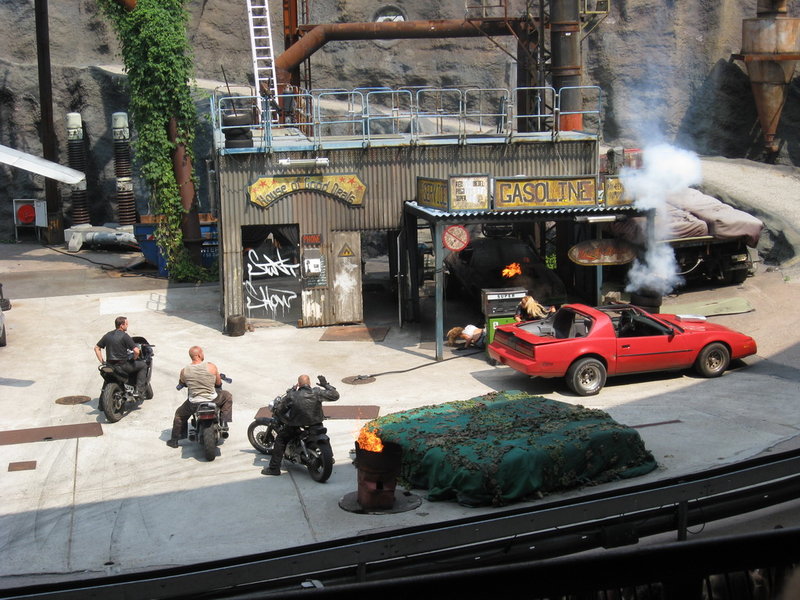 Das Highlight des Tages bot die Stuntshow im Filmpark. Eine optisch alt aufgebaute Kulisse aus dem 90er Jahren war Schauplatz einer Actionreichen Show aus Kampf-, Schuss-, und Fahrszenen welche durch Ton und Pyrotechnische Effekte verstärkt wurde.