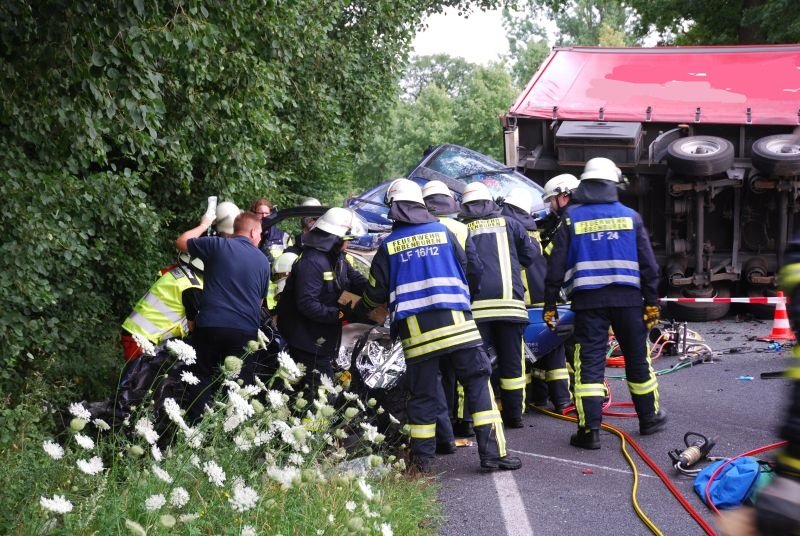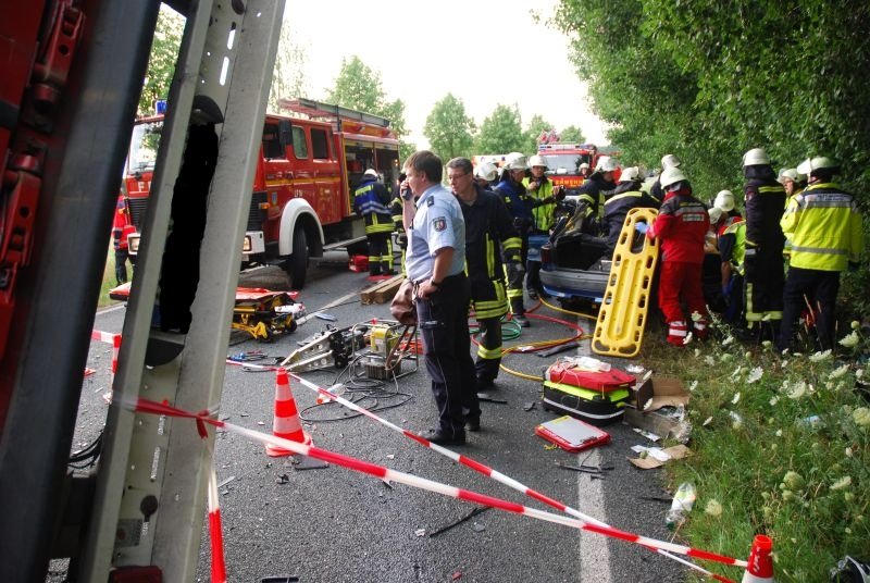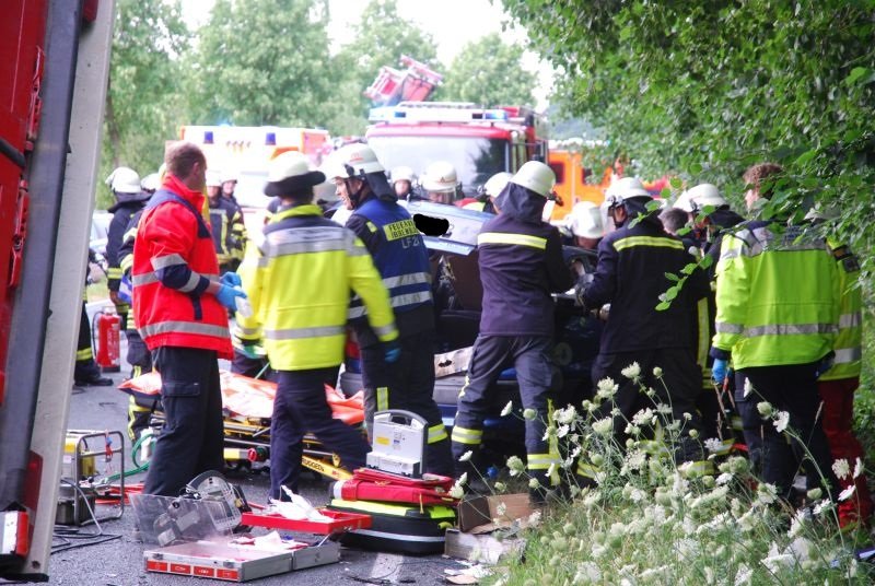 Ein PKW war mit einem im Gegenverkehr befindlichen LKW zusammengestoßen. Fahrer und Beifahrerin des PKW wurden in ihrem Fahrzeug eingeklemmt. Der Fahrer des LKW konnte sich selber leichtverletzt aus seinem Fahrzeug befreien und wurde vom Rettungsdienst betreut.