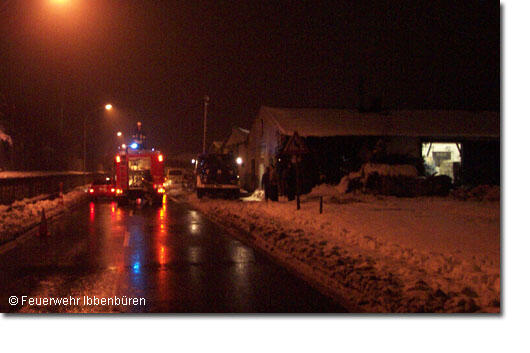 Am Montagabend - ein regulärer Dienstabend - wurde die Feuerwehr Ibbenbüren zur Unterstützung des THW angefordert.Morgens hatte der THW-Ortsverband Ibbenbüren den Auftrag ausgeführt weitere Stromaggregate in das immer noch stromlose Schöppingen zu fahren. Während des Rückweges zur Unterkunft erreichte ihn die nächste Alarmierung: bei einem Ibbenbürener Unternehmen an der Laggenbecker Straße waren Teile einer Lagerhalle durch die enorme Schneelast zusammengebrochen. Gegen 18 Uhr rückte die erste Bergungsgruppe des THW aus. Nachdem ein Statiker das Gebäude begutachtet hatte, wurde die restliche Dachkonstruktion durch die Kollegen des THW mit Holz abgestützt.