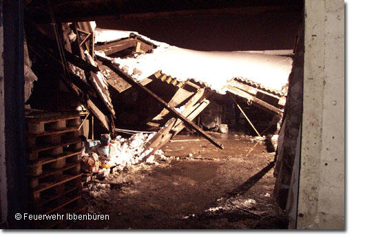 Technische Hilfe: Lagerhallendach durch Schneelast eingestürzt