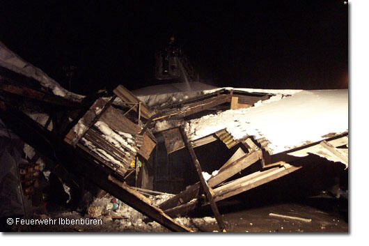 Anschließend wurde die Feuerwehr Ibbenbüren angefordert um den restlichen Schnee vom Dach zu spritzen. Hierzu wurde die Drehleiter eingesetzt. Die Arbeit gestaltete sich aber als schwierig, da die hohe und sehr feste Schneedecke keineswegs durch das Wasser mal eben weggespült werden konnte. Auch der Einsatz warmen Löschwassers (Entnahme am Kühlturm des RWE-Kraftwerks) brachte keine Besserung. So wurde das Schneebrett mit dem Wasserstrahl Stück für Stück "abgeschnitten".
