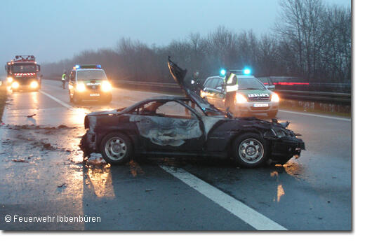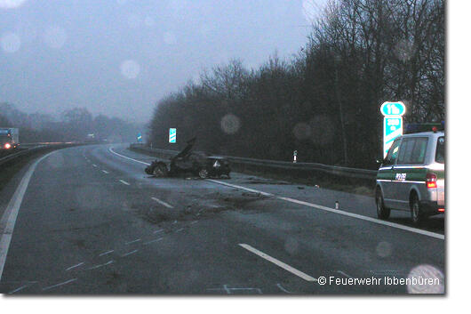 Zu einem Pkw-Brand auf der BAB 30 wurde der Löschzug Stadtmitte 1 der Freiwilligen Feuerwehr Ibbenbüren am Montagmorgen, um 6.30 Uhr alarmiert.Der Fahrer eines Mercedes SLK war aus noch ungeklärten Gründen mit seinem Wagen mehrfach links und rechts in die Leitplanken geraten und schließlich quer zur Fahrbahn zum Stehen gekommen. Dabei hatte das Fahrzeug Feuer gefangen und war schlagartig in Vollbrand geraten, wie ein Augenzeuge berichtete. Der Fahrer und alleiniger Insasse des Wagens kam bei dem Unfall ums Leben.