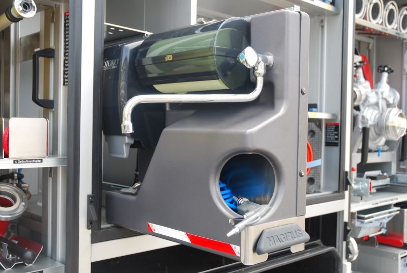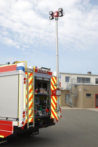 Fest eingebaut ist ein 1200-l-Löschwassertank und ein pneumatischer Lichtmast.
