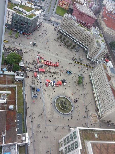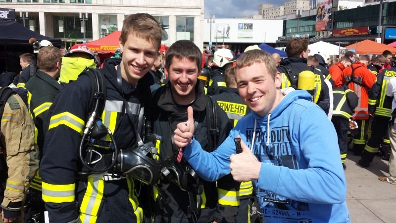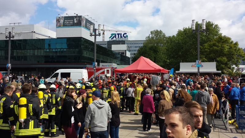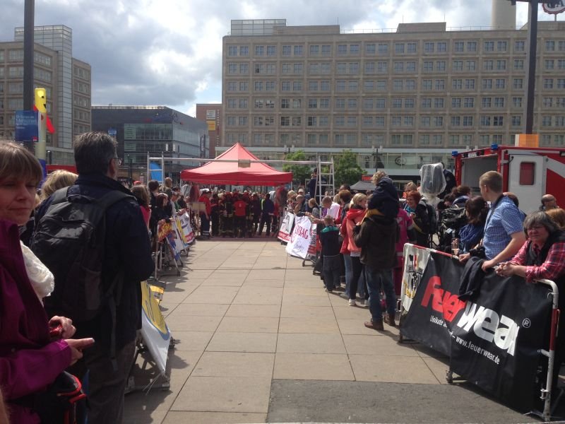 Unter kompletter Feuerwehrschutzausrüstung und angeschlossenem Atemschutzgerät ging es für die Zweierteams im 30 sec. Abstand die 400 Meter über den Alexander Platz, und über den Haupteingang des Park Inn Hotels in Richtung Treppe.