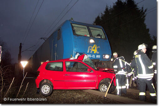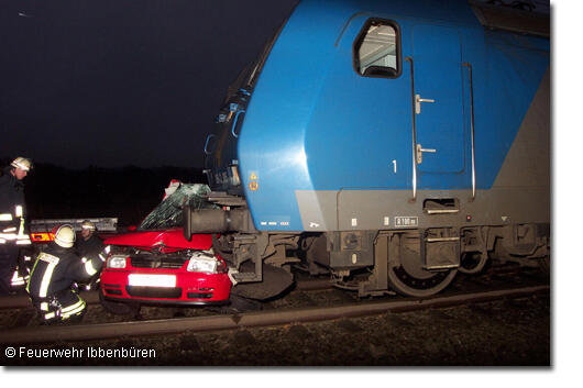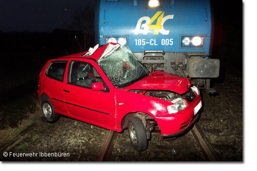 Die Löschzüge Laggenbeck und Stadtmitte 2 der Freiwilligen Feuerwehr Ibbenbüren wurden am Samstag um 07:51 Uhr mit dem Stichwort "Eingeklemmte Person - Pkw gegen Zug" zu einem Verkehrsunfall alarmiert.Auf dem Bahnübergang Permer Stollen in Osterledde war ein Pkw zum Stehen gekommen und anschließend von einem aus Richtung Rheine kommenden Güterzug erfasst worden. Der Wagen wurde gut 150 Meter weit mitgeschleift.