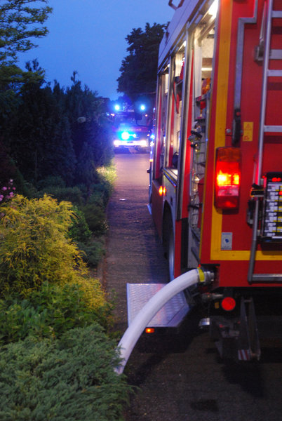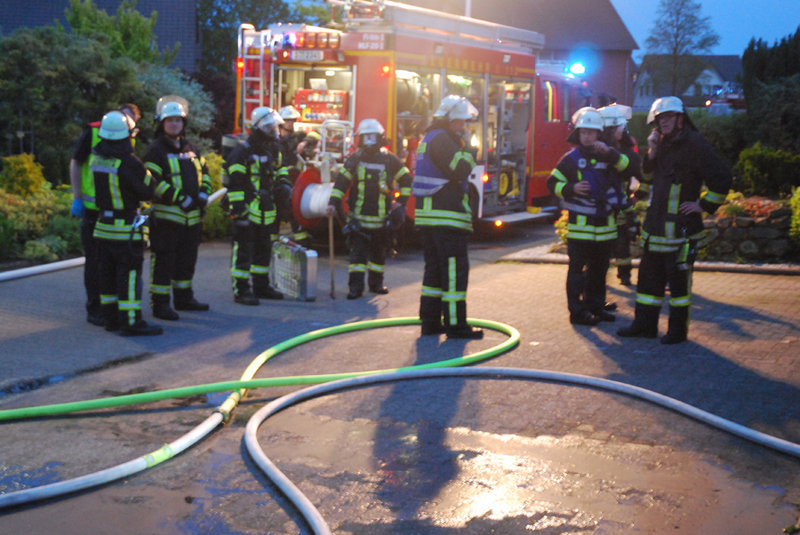 Die ersteintreffenden Kräfte fanden eine stark verrauchte Garage eines Einfamilienhauses vor. Ein Trupp ging unter umluftunabhängigem Atemschutz mit einem C-Rohr zur Erkundung vor. Als Brandursache fand der Trupp ein brennendes Schweißgerät, welches schnell gelöscht werden konnte. Die Wasserversorgung wurde vom Tank des HLF20-1 gestellt.