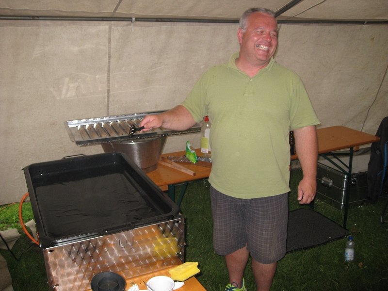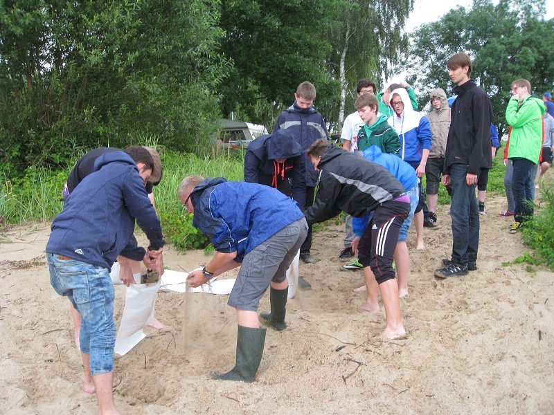 Da der Wetterbericht auch für den Abend nichts Gutes vorhersagte, wurden die Zelte noch extra verstärkt und mit Sandsäcken beschwert.