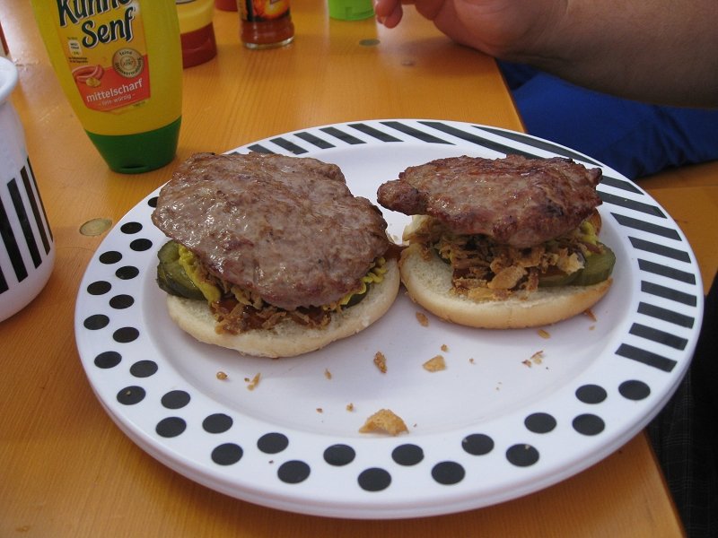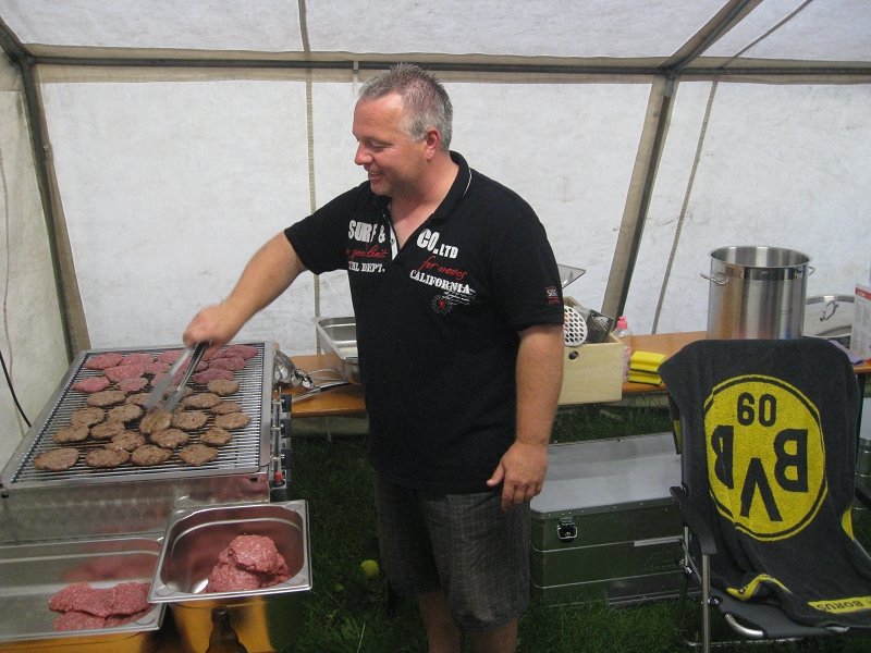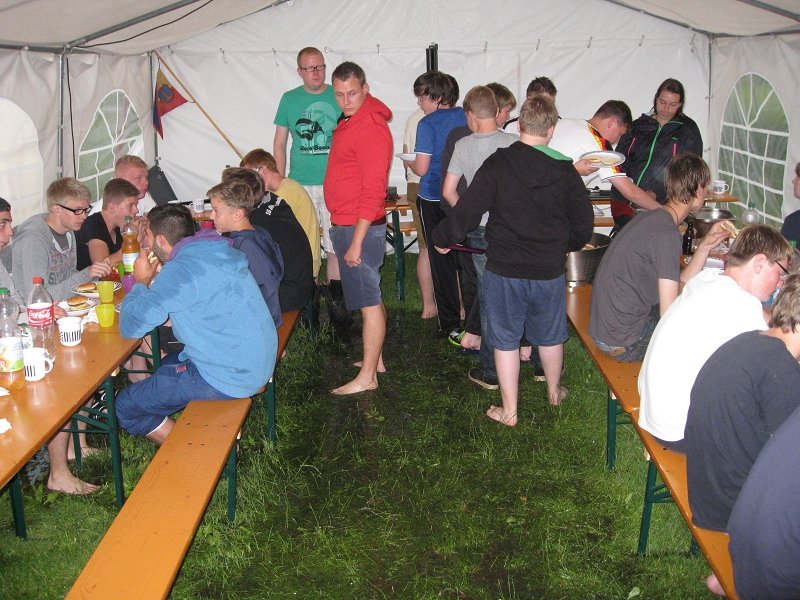 Zum Abendessen gab es leckere Hamburger mit Ketchup, Remulade, Gurken und Röstzwiebeln. Das leckere Essen sorgte bei der Mannschaft trotz des Regens für beste Stimmung und nach dem Abendessen hörte es dann auch endlich auf zu regnen.
