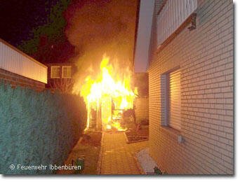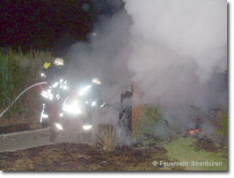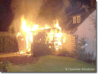 Der Löschzug Stadtmitte 1 der Freiwilligen Feuerwehr Ibbenbüren wurde in der Nacht von Samstag auf Sonntag, um 00:02 Uhr, zu einem Zimmerbrand in der Straße "An der Ökonomie", alarmiert. So lautete zumindest das Alarmstichwort.Tatsächlich fanden die Kräfte aber den Vollbrand eines kleinen Holzgartenhauses vor, in dem Fahrräder, ein Rasenmäher und sonstige Gartengeräte untergebracht waren. Löschversuche von betroffenen Anwohnern blieben zuvor erfolglos.