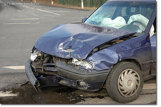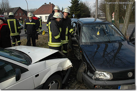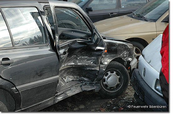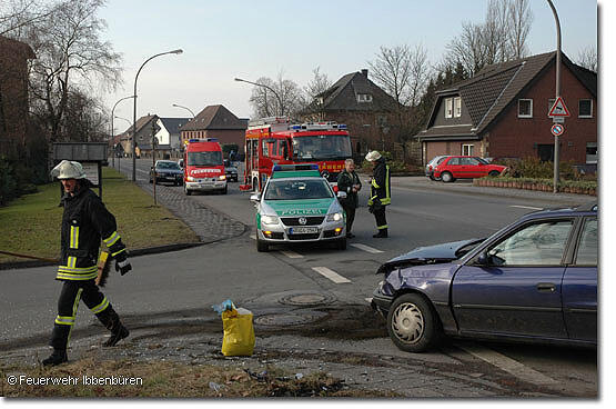Der Löschzug Stadtmitte 2 der Freiwilligen Feuerwehr Ibbenbüren wurde am Sonntag um 14:03 Uhr zu einem Verkehrsunfall mit eingeklemmter Person alarmiert. Zwei Personen sollten verletzt sein. Zwei Pkw waren in Höhe des Abzweigs Bergeshöhe auf der Rheiner Straße miteinander kollidiert. Eines der beiden Fahrzeuge wurde in eine Reihe ausgestellter Wagen eines Fahrzeughändlers geschleudert und beschädigte dort mehrere Pkw. Zum Glück wurde jedoch niemand eingeklemmt und die beiden Fahrzeuginsassen wurden nur leicht verletzt. Von der Mannschaft des LF24 wurden die Fahrzeugbatterien abgeklemmt und ein Einlaufen von Betriebsstoffen in die Kanalisation verhindert – "K.w.K.e.". Beim Einrücken wurde das abbestellte LF16/12 zur nächsten Einsatzstelle, "Öl auf Straße", Rheiner Straße Abzweig Up de Hee, beordert. Dort musste eine 15 Meter lange und 40 cm breite Ölspur unbekannter Herkunft abgestreut werden. In der scharfen und unübersehbaren Kurve war Gefahr im Verzug, zumal bei dem zwar kalten aber sonnigen Wetter die ersten Motorradfahrer die kurvenreiche Strecke befuhren.