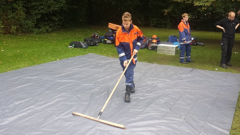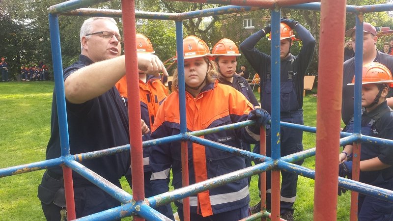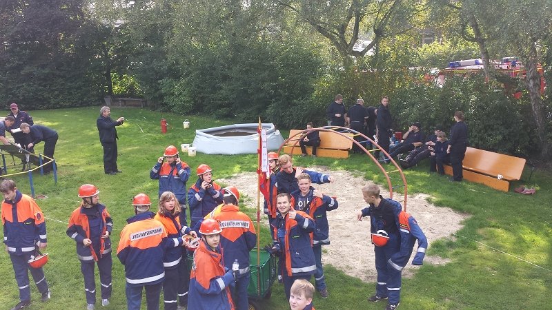 Die Kameraden aus Ibbenbüren, Hörstel und Hopsten besetzten die Station „Hindernislauf“ . Hier mussten die JF'ler in Fünfer-Gruppen einen Eimer Wasser durch ein Klettergerüst und über eine Rutsche befördern, ohne dabei Wasser zu verschütten. Im direkten Anschluss musste ein Kamerad mit dem Eimer Wasser auf einer Trage transportiert werden, und man musste weitere kleine Hindernisse bewältigen – und das alles auf Zeit! Des Weiteren gab es Stationen wie „Kisten Stapeln“, „Theorie“, „Schlauchkegeln“ etc.