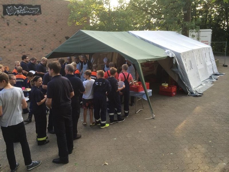 Gegen 18 Uhr hieß es dann „Ansitzen“, und die weit über 400 Teilnehmer trafen sich auf dem Schulhof der Gesamtschule. Nach der offiziellen Lagereröffnung, durch den stellv. Kreisjugendfeuerwehrwart Robert Laumann, gab es leckeres Gyros im Brötchen mit Tsatsiki und Kraut.
