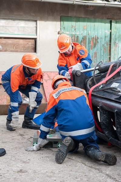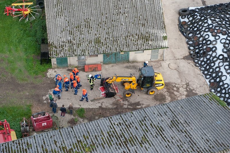 Des Weiteren wurde eine Person unter einer Schaufel eines Teleskopbaggers eingeklemmt. Die Schaufel hatte sich aus unbekannter Ursache aus der Halterung gelöst. Durch das anheben der Schaufel durch Spanngurte konnte die Person befreit werden.