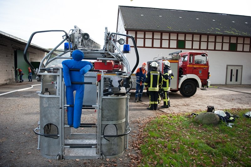 Angenommene Lage war, dass aus unbekannter Ursache ein Feuer in einer Scheune ausgebrochen war. Mehrere Trupps suchten die Scheune nach vermissten Personen ab und konnten diese auch retten und ins Freie befördern.