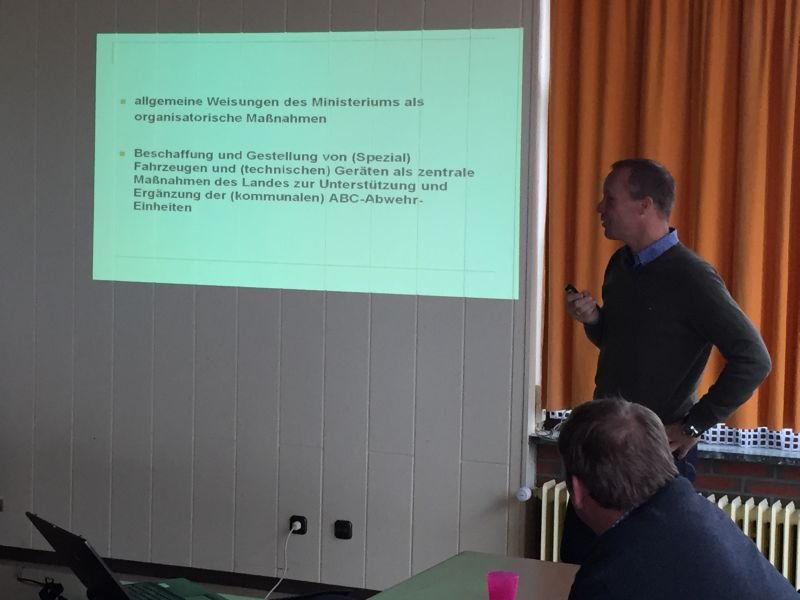 BOI Marko Lammerskitten berichtete über die Überörtliche geplante Hilfe in Bezug auf den Bereich ABC. Er stellte den ABC-Zug NRW, die ABC-Bereitschafft NRW und den Messzug NRW vor. Die im Kreis Steinfurt vorgehaltenen Komponenten wurden ebenfalls angesprochen und erläutert, die ABC-Züge Emsdetten und Ibbenbüren, die ABC-Erkunder NRW in Laggenbeck und Rheine sowie die Messleitkomponente Rheine und die DEKON-Komponenten des Kreises wurden vorgestellt.