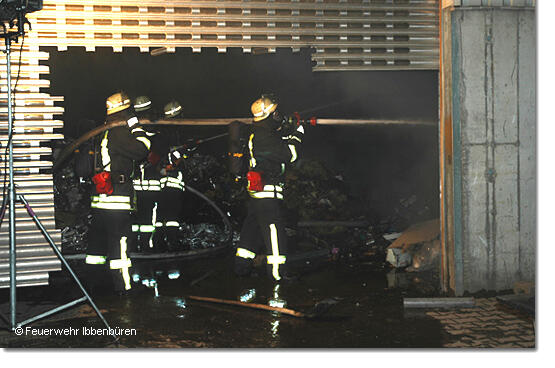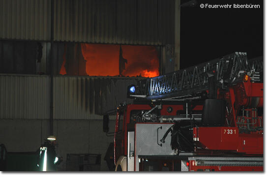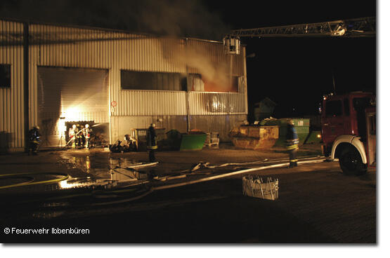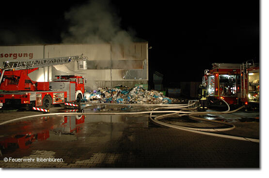 Der Löschzug Stadtmitte 1 der Freiwilligen Feuerwehr Ibbenbüren wurde am Montag um 21:50 Uhr zu einem Brand bei der Fa. WOITZEL Entsorgung, im Gewerbegebiet Uffeln, alarmiert.Wie schon einmal, am 25. August 2003, war in einem Teil einer etwa 60 x 30 Meter großen Halle dort gelagerter Müll in Brand geraten. Das Feuer hatte bei Eintreffen der ersten Kräfte bereits einen Teil der Lichtbänder zerstört - dichter Rauch qoll nach draußen. Die Rauchabzugklappen hatten nur zum Teil geöffnet. Es waren keine Personen im Gebäude.