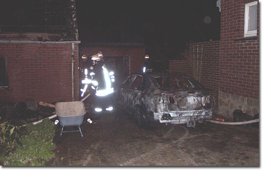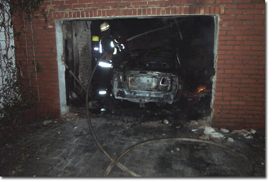 Der Löschzug Stadtmitte 1 der Freiwilligen Feuerwehr Ibbenbüren wurde am Montag um 22:36 Uhr zu einem Garagenbrand in der Gravenhorster Straße alarmiert. In der Garage befand sich noch ein Pkw. Keine Personen in Gefahr.Bei Eintreffen der ersten Kräfte schlugen die Flammen bereits aus dem durchgebrannten Flachdach der neben einem Einfamilienhaus frei stehende Garage. Der darin stehende Pkw stand in Vollbrand. Auch auf eine im Winkel angebaute zweite Garage (mit Dachstuhl) und ein Kaminholzlager hatte das Feuer schon übergegriffen. Aus der zweiten Garage konnte ein Motorrad noch vor den Flammen gerettet werden.
