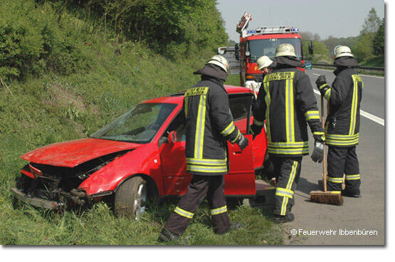 Zum zweiten Einsatz an diesem Sonntag, dem 7. Mai, wurde erneut der Löschzug Stadtmitte 1 der Freiwilligen Feuerwehr Ibbenbüren alarmiert. Und wie bei dem vorhergehenden Alarm ging es auch diesmal wieder auf die A30 in Fahrtrichtung Holland - wieder zwischen dem Rastplatz Brockbachtal und der Anschlussstelle Laggenbeck. Diesmal war ein Pkw von der Fahrbahn abgekommen und hatte sich mehrfach überschlagen.Nach Angaben der Autobahnpolizei befuhr ein 26-Jähriger Alleininsasse mit seinem Pkw die linke Spur, als der hintere rechte Reifen platzte. Das Fahrzeug geriet ins Schleudern und kam (ohne andere Fahrzeuge zu berühren) quer nach rechts von der Fahrbahn ab auf die Böschung, wo es sich mehrfach überschlug. Dabei wurde der Fahrer schwer verletzt und nach ersten Angaben vermutlich eingeklemmt.