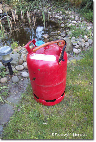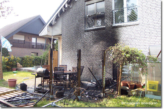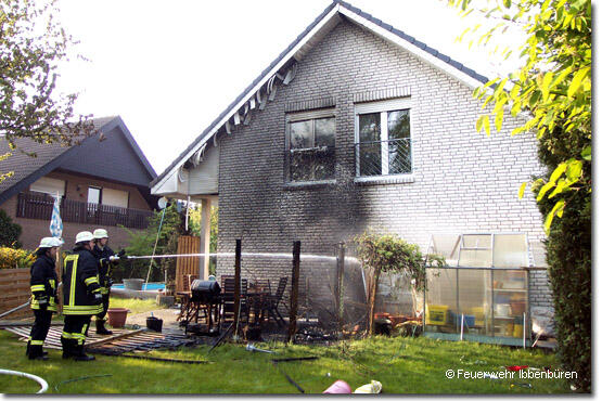 Zu ihrem dritten Einsatz an diesem Sonntag, dem 7. Mai, wurde die Freiwilligen Feuerwehr Ibbenbüren am späten Samstagnachmittag alarmiert (diesmal tatsächlich der überfällige Zug Stadtmitte 2). Unter dem Stichwort "Zimmerbrand" wurde um 17.38 Uhr ein Feuer auf der Terrasse eines Wohnhauses im Ortsteil Püsselbüren gemeldet.Das Feuer hatte die Sichtschutzzäune und Terrassenmöbel bereits erfasst und an der Fassade auch bereits die Kunsttoff-Traufenschalung erreicht, als es von beherzten Nachbarn gelöscht werden konnte, noch bevor das erste Löschfahrzeug die Einsatzstelle in der Wohnsiedlung erreicht hatte. Eine erhitzte Propangasflasche wurde von den Einsatzkräften zum Abkühlen in einen Gartenteich verbracht und Nachlöscharbeiten wurden durchgeführt.