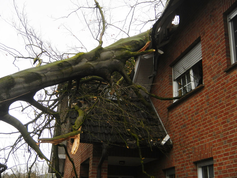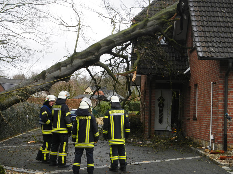 -ust- Eine große Buche war durch den Sturm auf ein Haus gefallen. Drei Personen befanden sich im Haus, die aber unverletzt blieben. Beseitigung des Baumes durch ein Privatunternehmen.