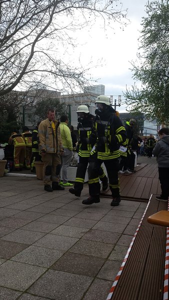 Unter kompletter Feuerwehrschutzausrüstung und angeschlossenem Atemschutzgerät ging es für die Zweierteams im 30-Sek.-Abstand die 400 Meter über den Alexanderplatz, und über den Haupteingang des Park Inn Hotels in Richtung Treppe.