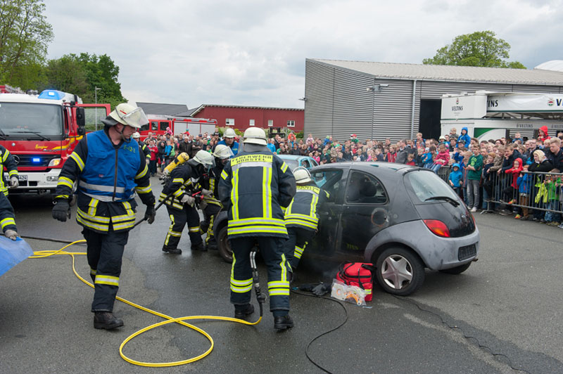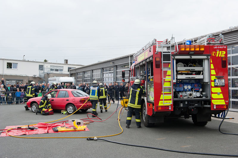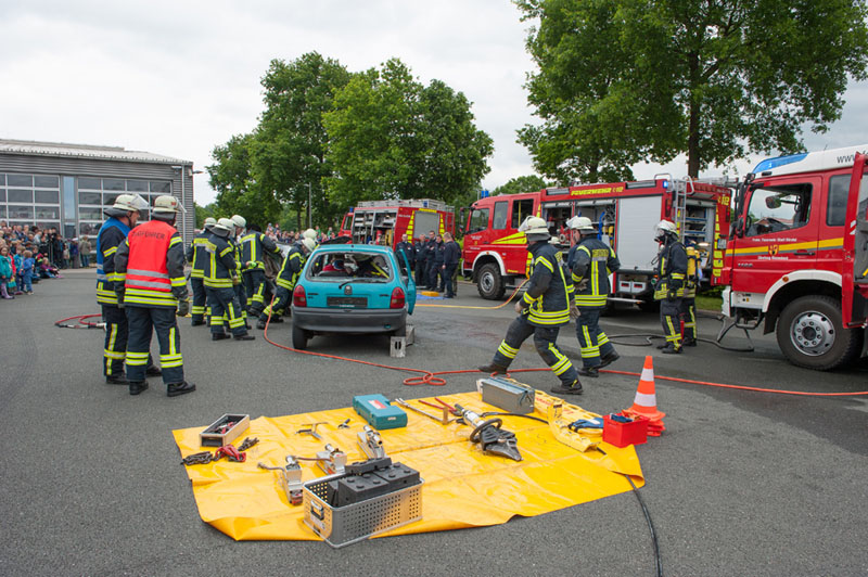 Auf dem Übungsgelände zeigten über den Tag verteilt verschiedene Wehren, was unter anderem zu den Aufgaben der Feuerwehr gehört. Zunächst zeigte eine Gruppe vom Löschzug Lienen-Kattenvenne die notwendigen Arbeiten zur technischen Hilfeleistung bei einem Verkehrsunfall eines Pkw mit einer eingeklemmten Person. Den Zuschauern wurden die Handgriffe und Gerätschaften dabei fachlich erläutert.