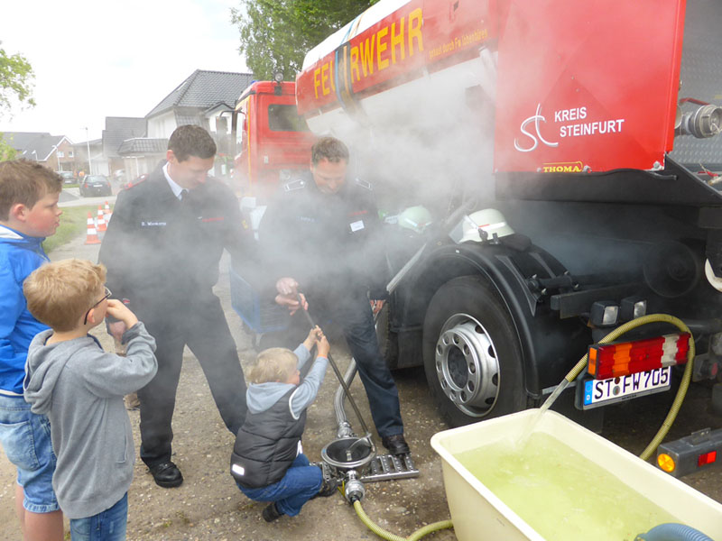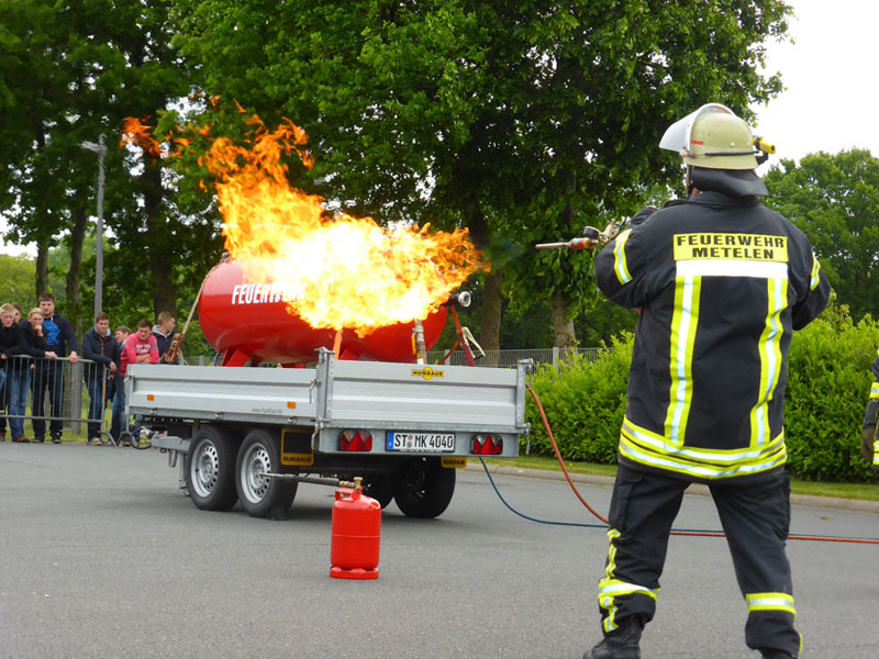 Die Feuerwehr Metelen wartete mit einem spektakulären Gasbrand auf, der mit viel Wasser zur Kühlung des (natürlich präparierten) Gastanks bekämpft wurde.