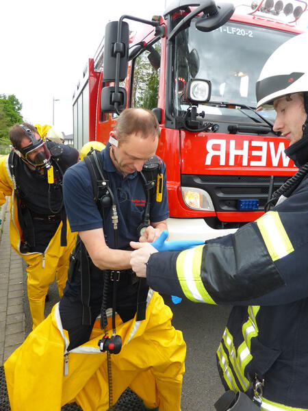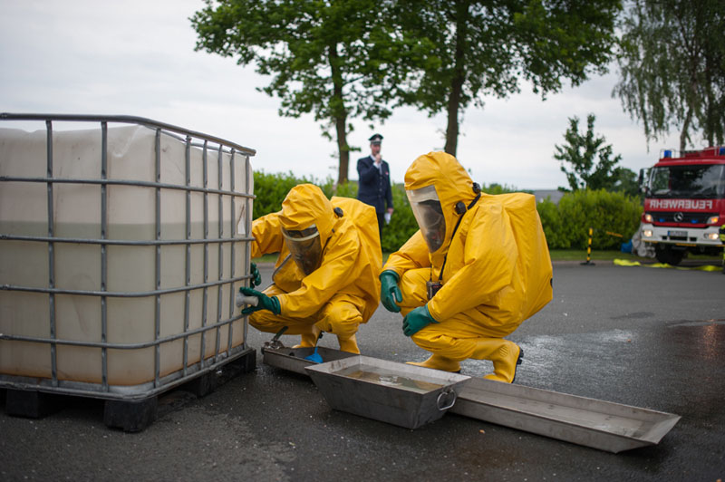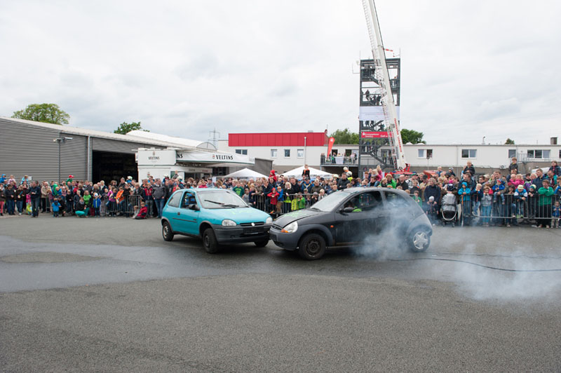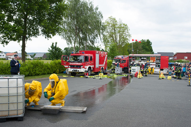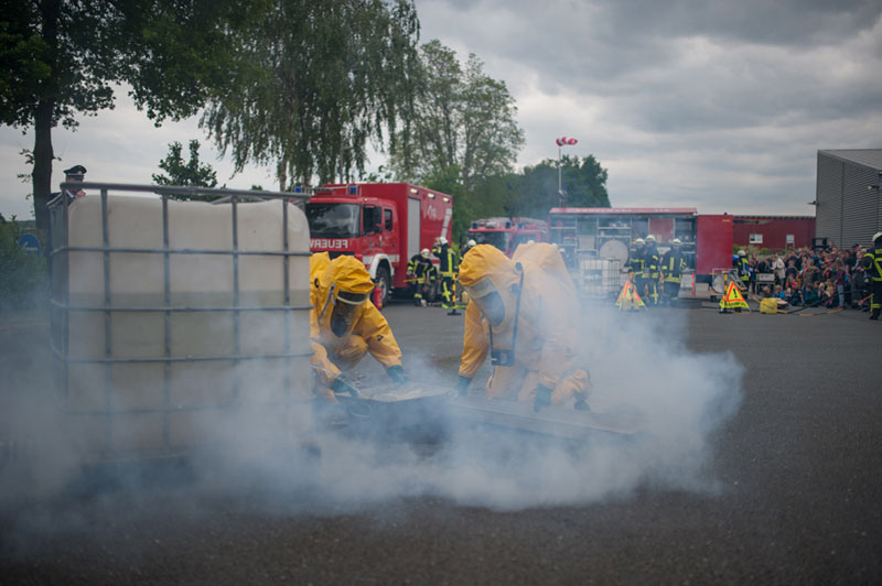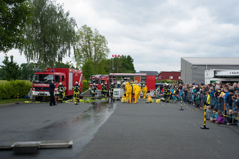 Die Kameraden des ABC-Zugs Emsdetten zeigten den Besuchern mit Aufbau und Durchführung einer technischen Hilfe bei einem Chemieunfall, wie die Feuerwehr für solche Fälle gerüstet ist. Hierbei, wie auch bei der anschließenden Vorführung der Löschzüge Hörstel-Bevergern und -Riesenbeck zur technischen Hilfe bei einem simulierten Frontalzusammenstoß zweier Pkw, wurden die Zuschauer von einem Moderator jeweils fachlich über die Arbeitschritte und eingesetzten Werkzeuge informiert.