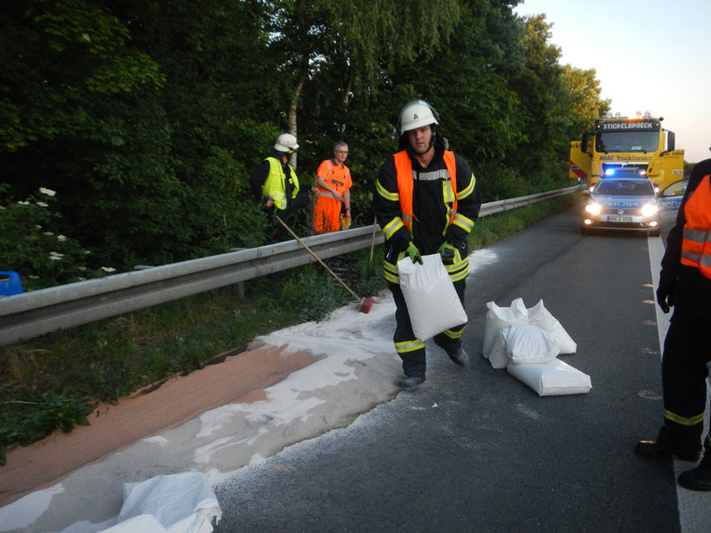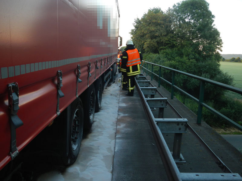 -ust- Auf der Autobahn A30 war bei einem Lkw der Dieseltank so stark beschädigt worden – möglicherweise durch überfahrene Reifenteile – dass Diesel auslief.
