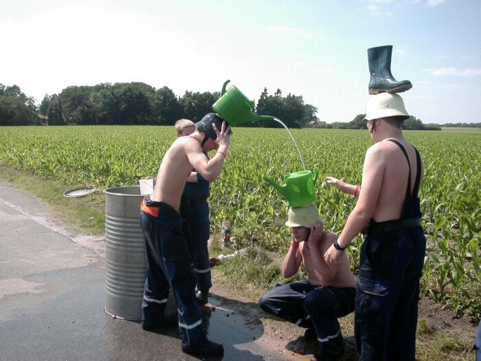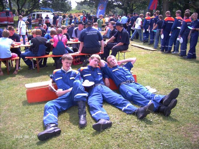 In Neuenkirchen erwartete uns ein wunderschöner Zeltplatz an einem Baggersee auf dem Gelände des örtlichen Freibades. Das alleine reichte nicht, wir durften auch noch alles kostenlos benutzen, bis auf die Duschen, denn die Wertmarken für das warme Nass waren etwas knapp bemessen, aber wir sind ja Feuerwehrleute und da weiss man sich dann schon zu helfen.