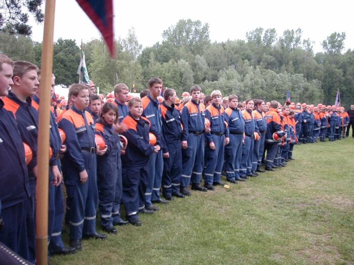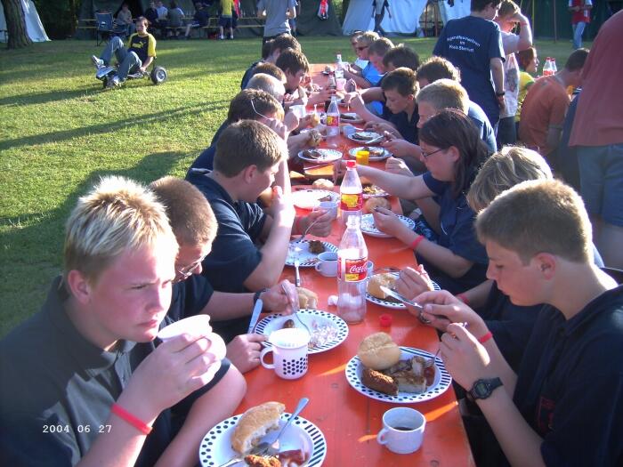 Am nächsten Morgen ging es nach dem reichhaltigen Frühstück unter Mutter Naturs sonnen-strahlendem Himmel frisch gestärkt auf zum in das Zeltlager integrierten Orientierungsmarsch, der in jedem Jahr stattfindet. Beide Ibbenbürener Gruppen marschierten die 14,5 Kilometer bei herrlichem Sonnenschein mit Wimpel voran ohne nennenswerte Zwischenfälle. Alle zehn Stationen wurden nicht nur gefunden, sondern auch teilweise bravourös gemeistert. Von verschieden Geschicklichkeitsspielen über einen Feuerwehrtheoretischen Teil, sowie das Anschlagen von Lasten mittels einer losen Rolle und diversen Wasserspielen gab es natürlich auch einiges zu sehen.