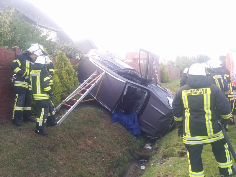 Auf der Tecklenburger Straße war ein mit zwei Personen besetzter Pkw von der Fahrbahn abgekommen, hatte sich überschlagen und war im Straßengraben auf der Seite liegen geblieben. Der Beifahrer konnte das Fahrzeug noch vor Eintreffen der Feuerwehr leicht verletzt verlassen, die Fahrerin - auch leicht verletzt - war aber im Fahrzeug eingeklemmt. Sie wurde durch die von der Feuerwehr als Zugang geöffnete Frontscheibe aus dem Pkw befreit.