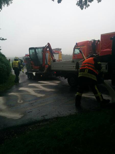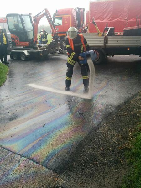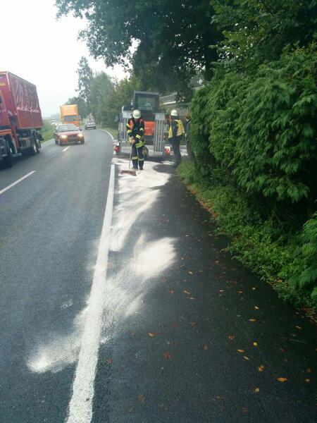-hw- Ölspur nach einem Motorplatzer auf der Riesenbecker Straße, in Dörenthe. Die Einsatzstelle wurde abgestreut und an den Straßenbaulastträger übergeben.