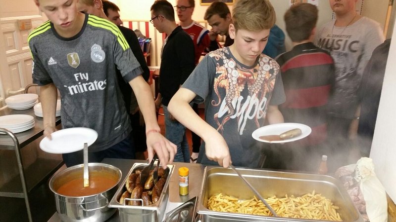 Auf dem Speiseplan stand die im Münsterland als „Manta-Platte“ bekannte Mahlzeit. Pommes mit Bratwurst und selbstgemachter Curry-Soße sorgten bei allen für Begeisterung.
