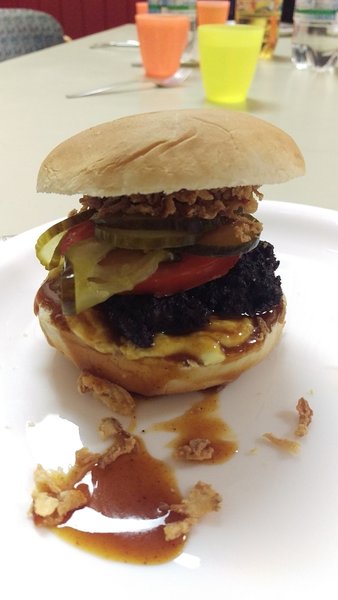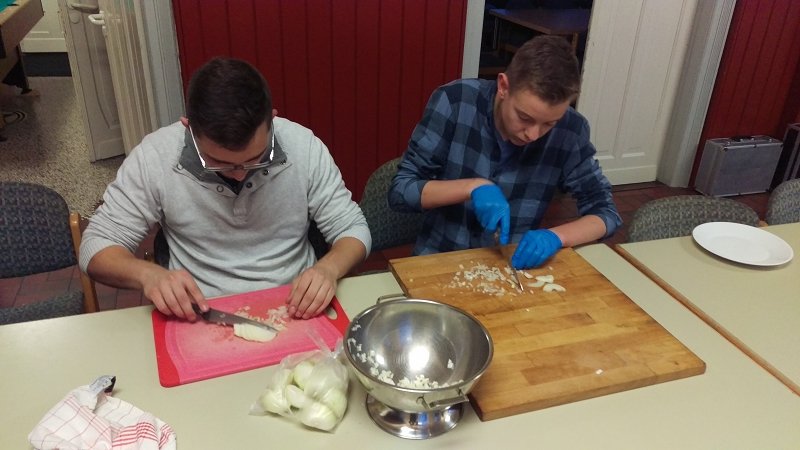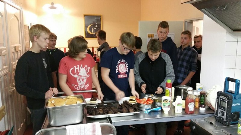 Zum Abendessen bereitete der Küchendienst leckere Hamburger vor. Buletten wurden geformt und gebraten, Zwiebeln und Tomaten geschnitten, Brötchen halbiert und weitere Kleinigkeiten vorbereitet. Somit konnte jeder seinen Burger individuell zusammenstellen.